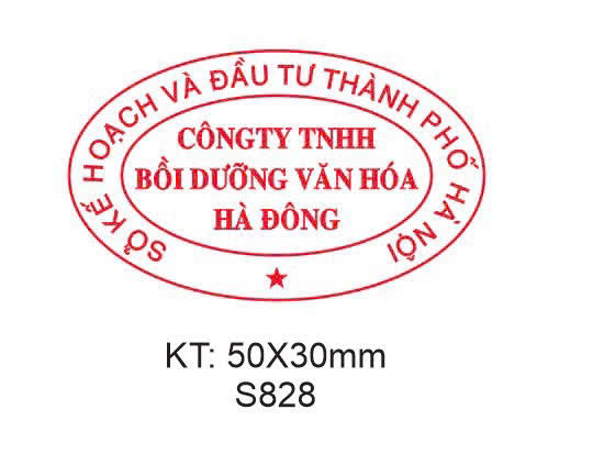 - Tên doanh nghiệp đúng theo Giấy chứng nhận đăng ký doanh nghiệp; Mã số thuế; Có thể thêm địa chỉ trụ sở chính, logo hoặc slogan (không bắt buộc). Không được chứa nội dung vi phạm điều cấm: như từ ngữ phản cảm, vi phạm đạo đức xã hội, an ninh quốc gia. Sau khi được tư vấn bạn quyết định lựa chọn nội dung dấu elip gồm có tên công ty (Công ty TNHH bồi dưỡng văn hóa Hà Đông) và Sở kế hoạch và đầu tư thành phố Hà Nội. Dấu có kích thước 30 x 50 mm, mực đỏ, dấu liền mực.
