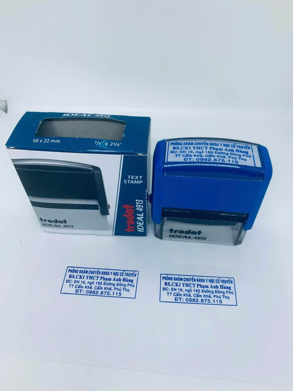 - Dấu vuông: Tên phòng khám, mã số thuế, địa chỉ phòng khám. Kích thước theo yêu cầu của từng đơn vị. Màu xanh hoặc màu đỏ.